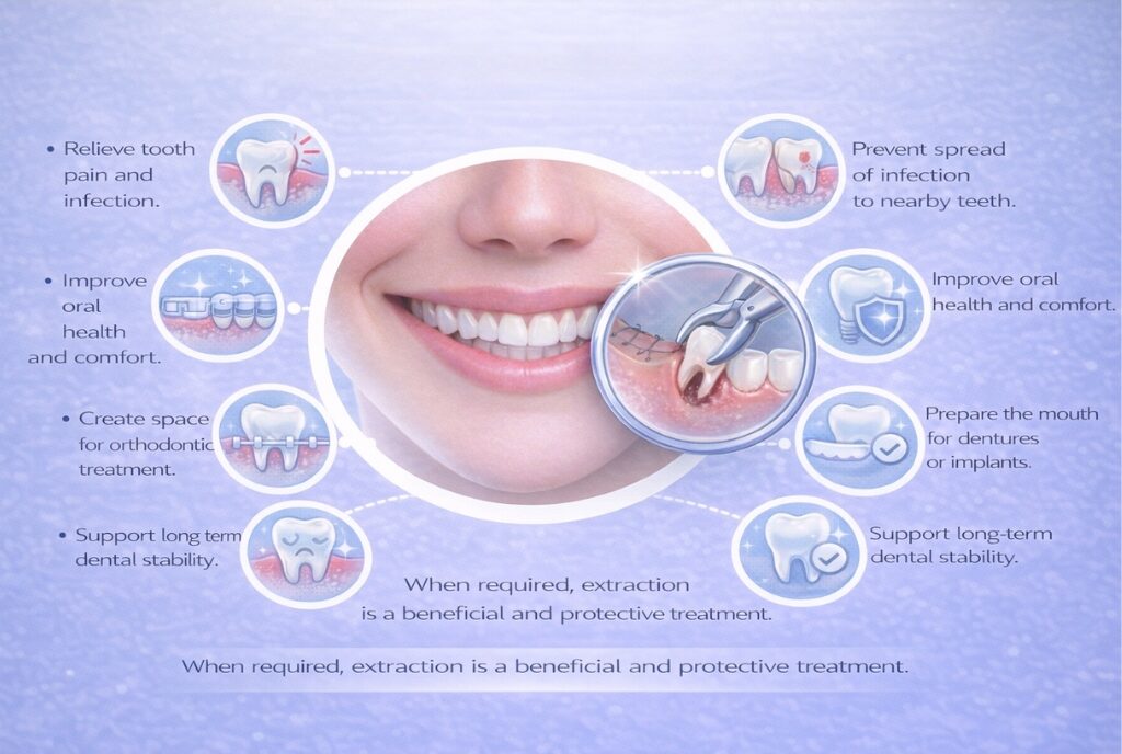 Dental extraction is the removal of a tooth that cannot be saved due to severe decay, infection, crowding, or trauma. The procedure is performed under local anesthesia to ensure comfort and is followed by proper aftercare to promote healing.