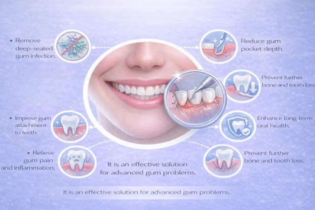 Flap surgery is a gum treatment where the gums are gently lifted to access deep infection beneath the gum line. The infected tissue, plaque, and tartar are removed, and the gums are repositioned securely to allow proper healing. This procedure helps control advanced gum disease and prevent tooth loss.