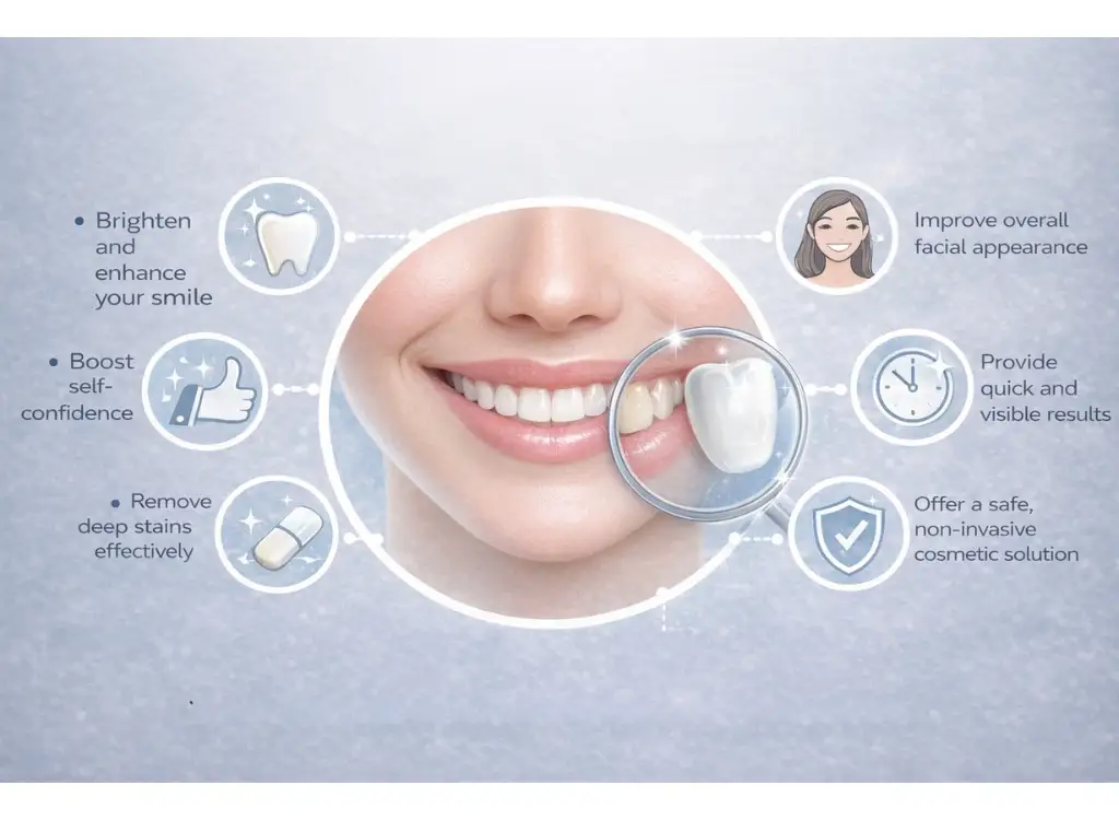 Teeth whitening is a professional procedure that removes stains caused by food, beverages, smoking, or aging. Using clinically approved whitening agents, the treatment lightens the natural shade of your teeth, giving you a brighter and more confident smile.